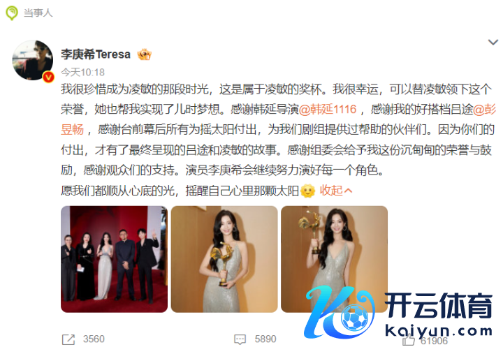 11月17日,李庚希发文谈:“我很概叹成为凌敏的那段时光,这是属于凌敏的奖杯。我很庆幸,不错替凌敏领下这个荣誉,她也帮我遣散了儿时梦思。”