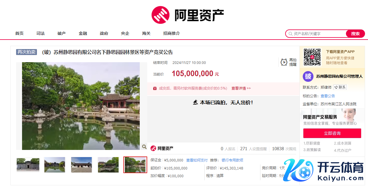 湖石叠山、小桥活水、九曲回廊……4A级旅游景区静想园被外界称为“江南第一私家园林”。11月26日,苏州静想园以1.05亿元的起拍价进行歇业拍卖。当代快报记者了解到,历程24小时竞拍,收场11月27日10时,因为无东谈主出价,苏州静想园歇业拍卖宣告流拍。