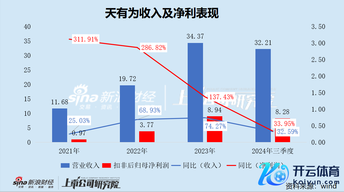 2021年至本年前三季度,天有为营业收入永诀为11.68亿元、19.72亿元、34.37亿元和32.21亿元,永诀同比增长25.03%、68.93%、74.27%和32.59%;扣非后归母净利润永诀为0.97亿元、3.77亿元、8.94亿元和8.28亿元,永诀同比增长311.91%、286.82%、137.43%和33.95%。