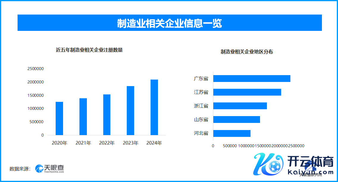 从区域踱步来看,广东省、江苏省、浙江省、山东省、河北省制造业关系企业数目位居前哨,分手为跳跃232.6万余家、205.6万余家、162万余家、141.8万余家和112.8万余家。